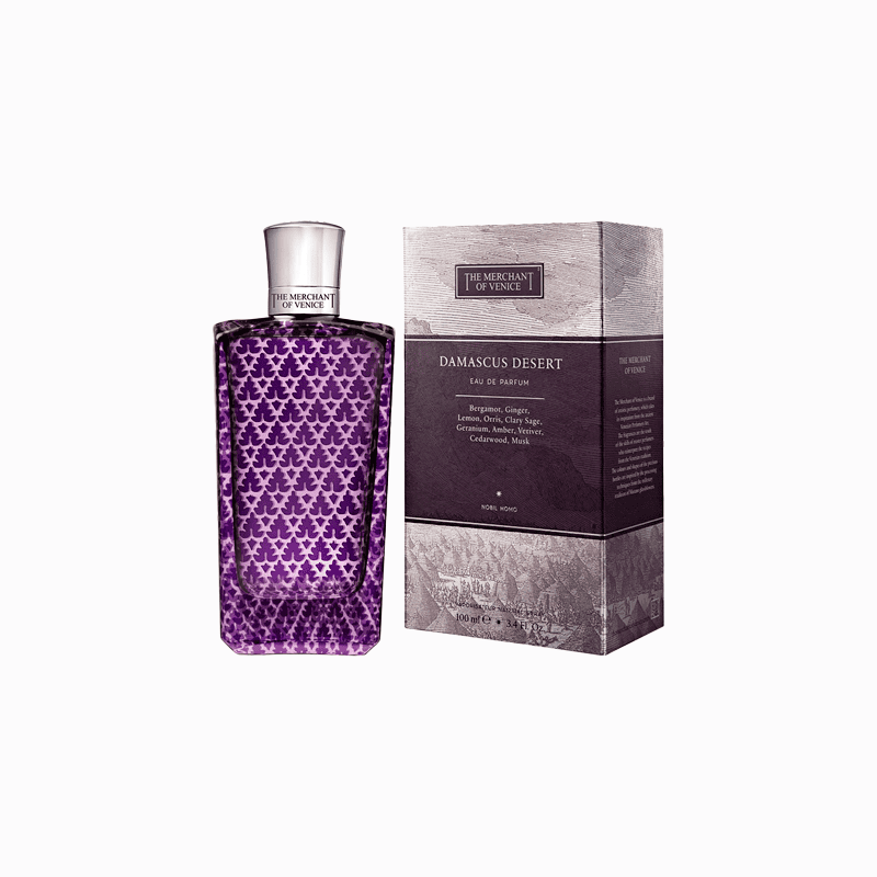 The Merchant of Venice Damascus Desert Eau de Parfum is a creative blend of freshness and warmth. It opens with zesty lemon, bergamot, and a hint of spicy ginger, transitioning into elegant floral and herbal middle notes of orris, clary sage, and geranium. The base is rich and grounded, featuring warm amber, earthy vetiver, and woody cedar, balanced by a subtle touch of musk.