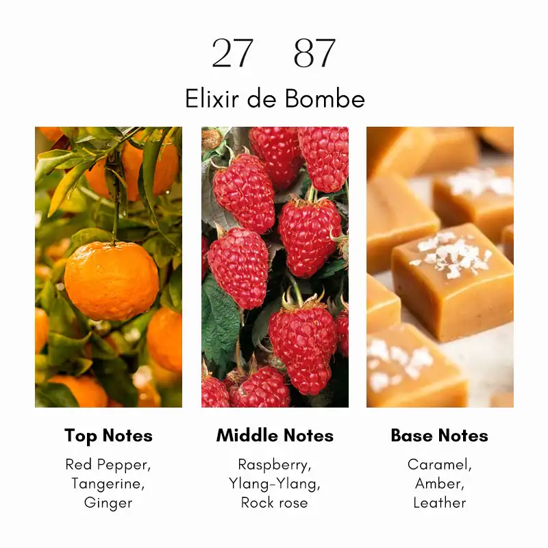27 87 Elixir de Bombe Eau de Parfum is a unisex fragrance that artfully combines vibrant fruity notes with warm gourmand undertones, offering a bold and dynamic scent experience suitable for various occasions.