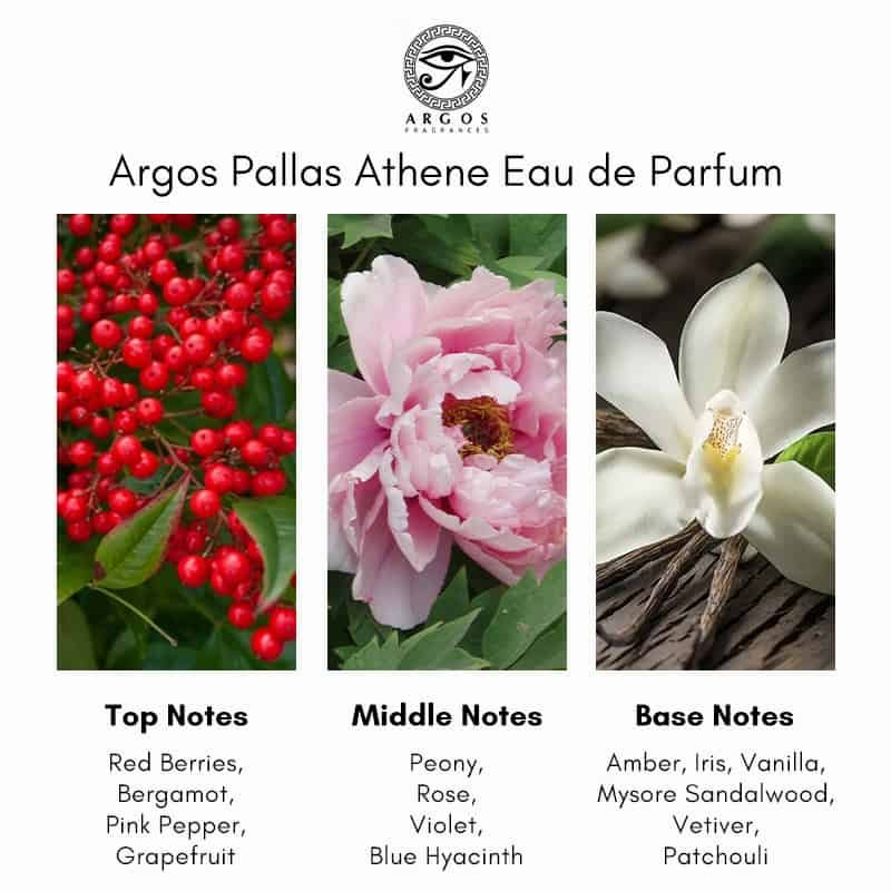 Pallas Athene opens with a bright and invigorating blend of bergamot, grapefruit, pink peppercorn, and red berry, creating a fresh and spicy introduction. The heart reveals a harmonious mix of peony, rose, blue hyacinth, and violet, adding depth and floral richness. As the fragrance settles, base notes of amber, vanilla, iris, Mysore sandalwood, patchouli, and vetiver provide a warm and woody foundation, resulting in a well-rounded and enduring scent profile.