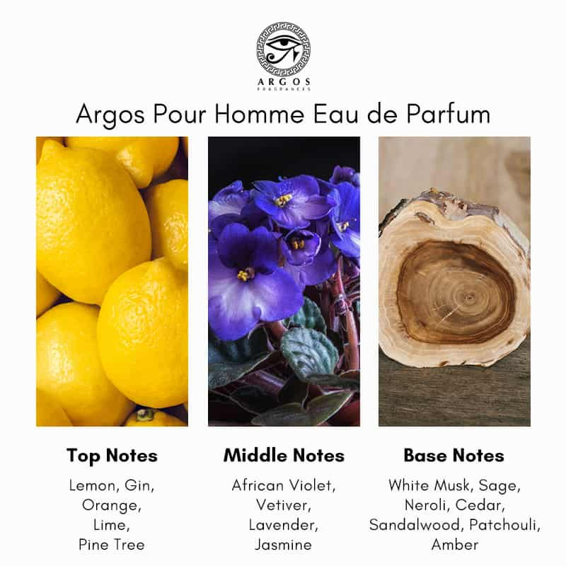 Argos Pour Homme opens with a refreshing burst of gin, lemon, lime, pine tree, and orange, offering a crisp and invigorating introduction. The heart reveals a blend of African violet, vetiver, lavender, and jasmine, adding depth with floral and green nuances. The base is composed of white musk, sage, neroli, amber, cedar, sandalwood, and patchouli, providing a warm and enduring foundation.