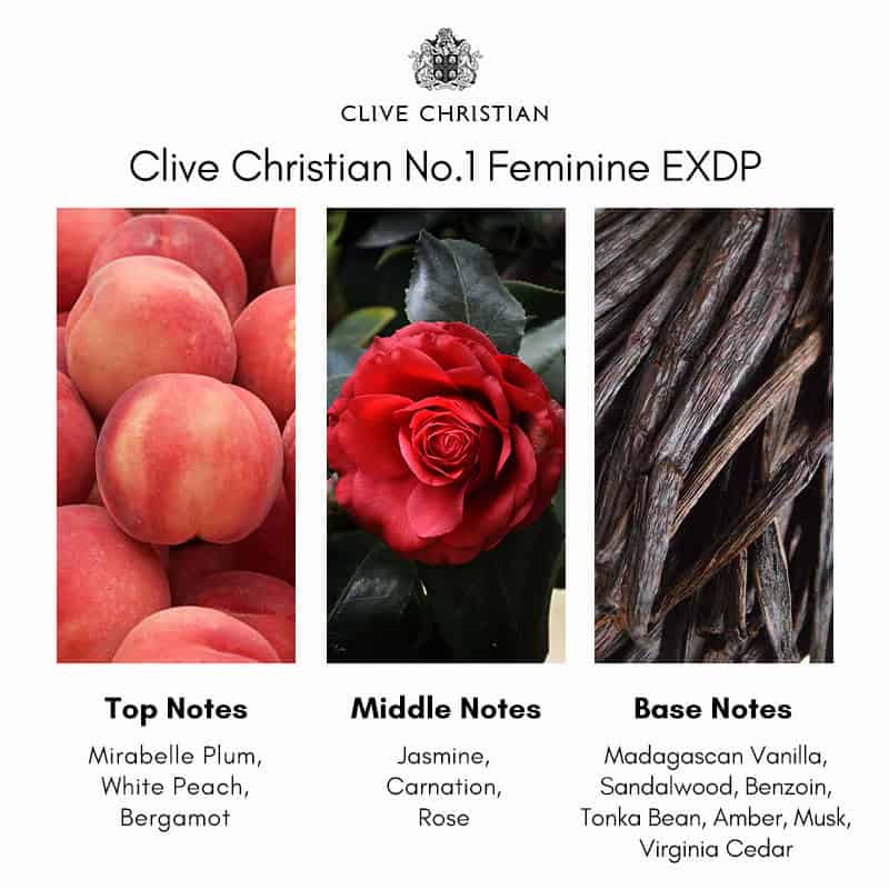 Clive Christian No.1 Feminine Extrait de Parfum opens with a vibrant and fruity blend of Mirabelle plum, white peach, and bergamot, offering a sweet and slightly citrus introduction. The heart of the fragrance reveals rich floral notes of jasmine, carnation, and rose, adding depth and a subtle spice to the composition. As the fragrance settles, the base is anchored by a warm, creamy, and woody foundation, with the luxurious combination of Madagascan vanilla, sandalwood, benzoin, tonka bean, amber, musk, and Virginia cedar, creating a lasting, sophisticated finish.