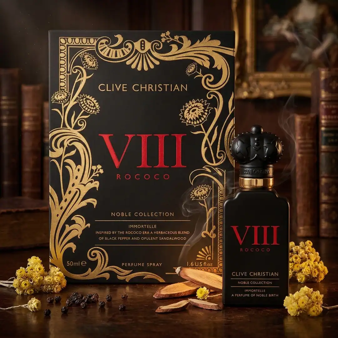 Clive Christian Noble Collection VIII Rococo Immortelle Eau de Parfum is a unisex fragrance that artfully blends the golden warmth of immortelle with spicy and woody nuances. Inspired by the opulence of the Rococo era, this scent offers a sophisticated and enduring olfactory experience.