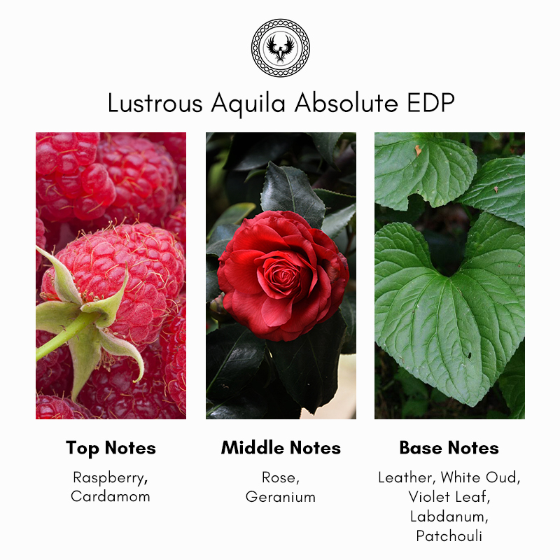 Aquila Absolute opens with a vibrant blend of juicy raspberry and aromatic cardamom, creating a fresh and inviting introduction. The heart reveals a rich floral bouquet of Turkish rose absolute and Egyptian geranium, adding depth and elegance. As the fragrance evolves, it settles into a warm and sophisticated base of Egyptian violet leaf absolute, patchouli, white oud, labdanum, and leathery notes, providing a smooth and lasting finish.