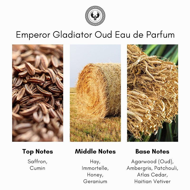 Gladiator Oud opens with a powerful blend of cumin and saffron, creating a spicy and warm introduction. The heart reveals a rich combination of honey, hay absolute, immortelle absolute, and Egyptian geranium, adding depth and complexity. As the fragrance evolves, it settles into a robust base featuring oud oil, Indonesian patchouli, ambergris, Atlas cedarwood, and Haitian vetiver, offering a woody and earthy finish. This composition captures the essence of strength and nobility, reflecting the spirit of the gladiators.