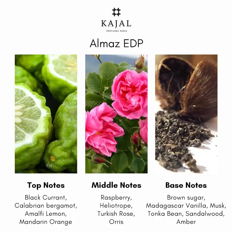 Kajal Almaz Eau de Parfum opens with a bright and juicy blend of bergamot and black currant. The citrus freshness of bergamot meets the slightly tart sweetness of black currant, creating a lively and vibrant introduction that immediately captures attention. The heart introduces a rich fruity floral accord built around raspberry, delicate floral notes, heliotrope, iris, and rose. Raspberry adds a playful sweetness, while heliotrope and iris contribute a soft powdery texture that enhances the elegance of the composition. The floral elements provide balance and sophistication, transforming the fragrance into a smooth fruity floral blend. In the base, the fragrance becomes warm and comforting. Musk and woody notes provide depth and structure, while vanilla and amber create a creamy warmth. Brown sugar adds a subtle caramelized sweetness, giving the dry down a soft gourmand character that lingers smoothly on the skin.