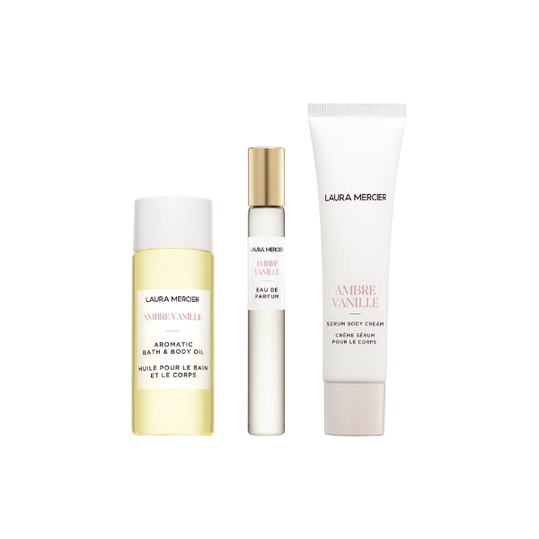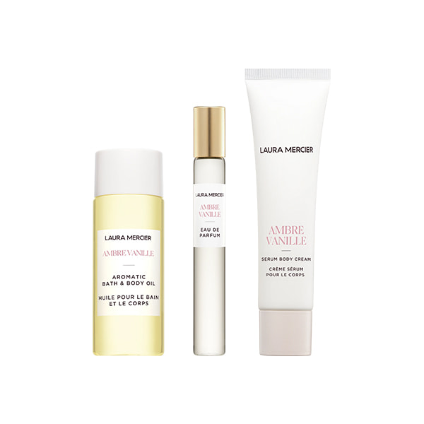 - A 3-piece set featuring Serum Body Cream, Aromatic Bath & Body Oil, and Eau de Parfum in the Ambre Vanille scent.