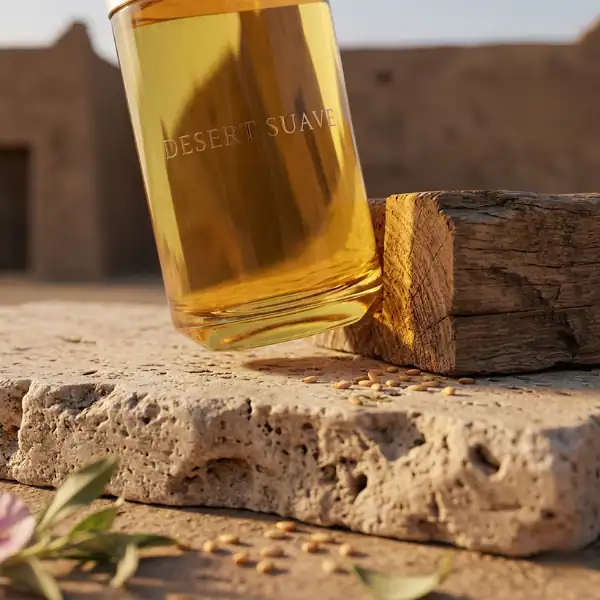 Désert Suave opens with a vibrant blend of cardamom, mandarin, and clove, delivering a warm and spicy introduction. The heart reveals a harmonious fusion of orange blossom, rose, and date, adding a rich, floral, and fruity depth. As the fragrance matures, it settles into a base of cistus, toasted sesame seeds, and cedar, offering a warm and lasting impression. This composition captures the essence of an oasis, blending the lushness of date palms with the warmth of the desert landscape.