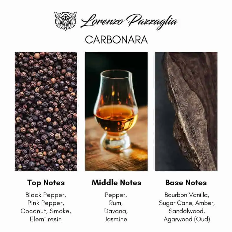 Overall, Carbonara resides in the gourmand-amber-spice space: sweet and creamy yet anchored by spicy and woody accords.