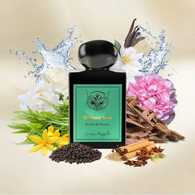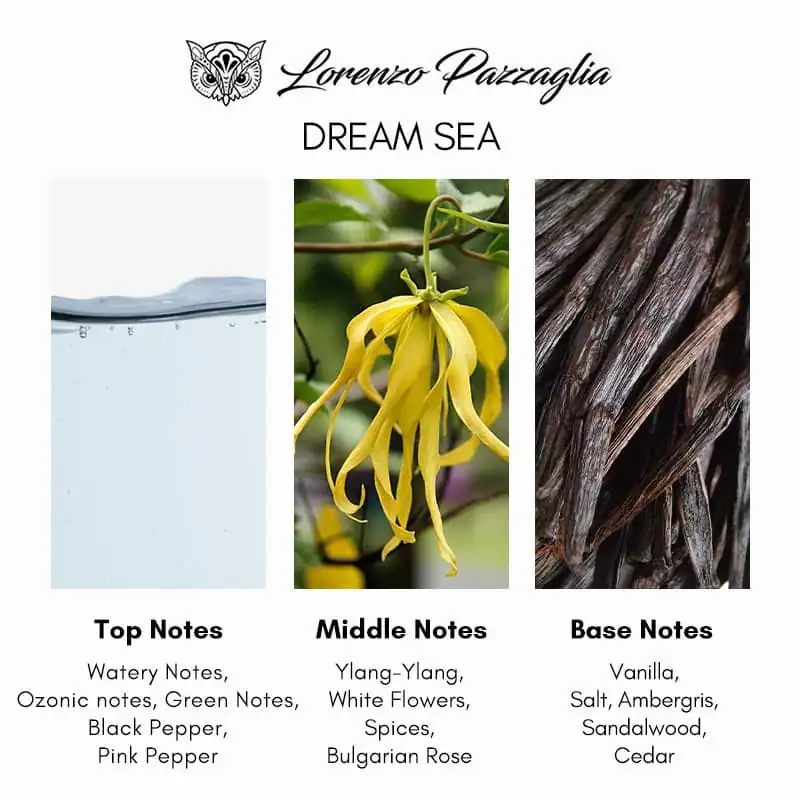 Dream Sea opens with a fresh burst of watery / aquatic and ozonic accords. These marine facets are brightened by green notes and edged with a touch of pink and black pepper, lending a slight spiciness that prevents the opening from being purely airy. The heart brings in a soft bouquet of white flowers, ylang-ylang, and Bulgarian rose, wrapped in warming spice nuances. These elements help transition the fragrance from aquatic freshness toward a more sensual, slightly floral core. In its base, Dream Sea reveals a saline / salty note paired with vanilla, giving a softly sweet but light gourmand impression. Ambergris (or an ambergris-inspired “Orientalgris” accord) adds marine warmth and depth. Sandalwood and cedar lend woody structure and smoothness. The overall character balances marine freshness with floral warmth and a gently creamy-woody dry-down. Its saltiness is subtle and never overpowering, while the vanilla remains delicate rather than gourmand. Parfumo reviewers describe it as “marine with a beautiful note of vanilla, lightly enhanced with a salty and ozonic touch.”