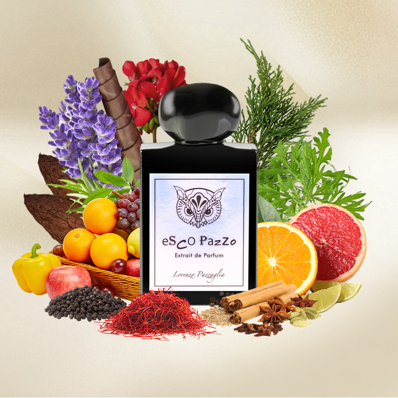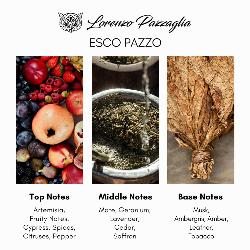 Esco Pazzo begins with a bright, citrusy burst—lemon, bergamot, and grapefruit combine with artemisia and cypress for an aromatic-herbal edge. Pepper and spices add sparkle and liveliness, introducing a tension between freshness and spiced sharpness. As the composition unfolds, saffron, geranium, and mate emerge to add a restrained spiced floral-green character. Cedar and lavender ground this mid-layer, bringing classical aromatic structure into the evolving blend. In its final phase, Esco Pazzo turns richer and warmer. Leather and tobacco lend a suave, animalic quality, while amber, musk, and ambergris (or Orientalgris) create a velvety oriental warmth. These elements anchor the fragrance and contrast the earlier freshness. The scent effectively bridges aromatic-fougère structure with bold oriental and leathery overtones. Its personality is dynamic: opening crisp and bright, then gradually shifting into smoky warmth and sensuality.