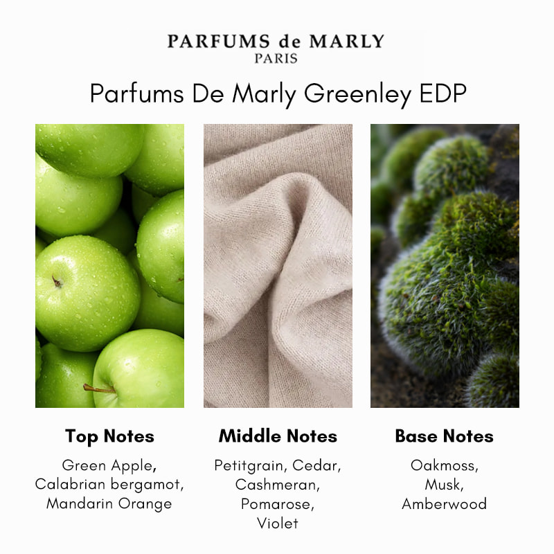 Parfums de Marly Greenley Eau de Parfum is a vibrant unisex fragrance that harmoniously blends fresh citrus and green apple notes with aromatic woods and musk, offering a modern and invigorating scent experience.