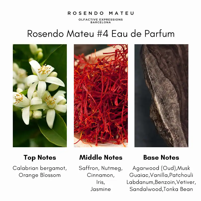 Rosendo Mateu No. 4 Eau de Parfum is a unisex fragrance introduced in 2017 by master perfumer Rosendo Mateu. This scent artfully combines rich spices, precious woods, and creamy vanilla, creating a luxurious and captivating olfactory experience.