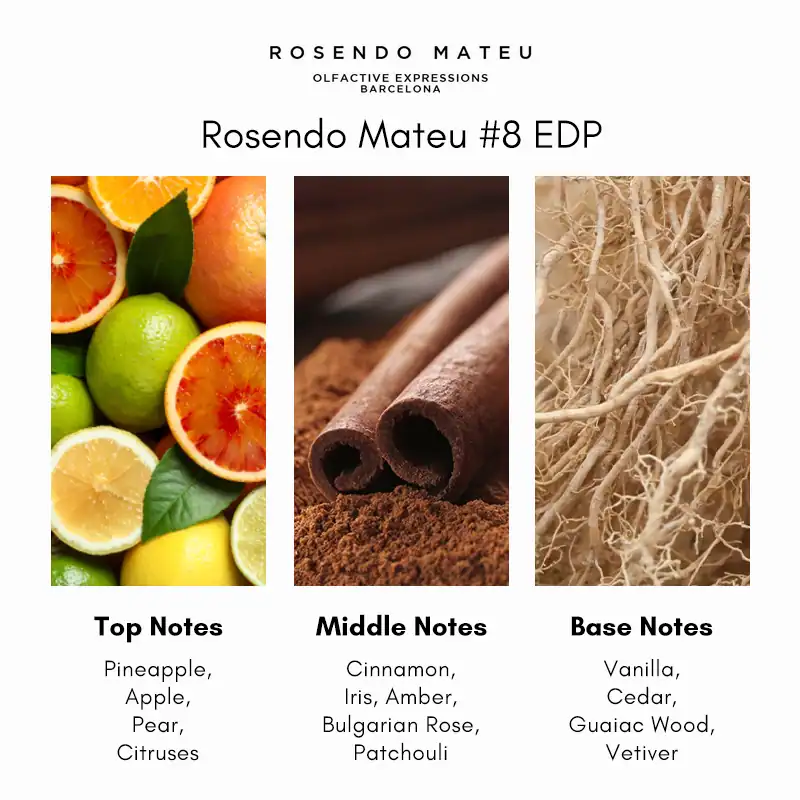 Rosendo Mateu No. 8 opens with a vibrant and tropical blend of pineapple, apple, pear, and citrus, creating an immediate sense of freshness and exotic allure. The heart reveals a rich and sensual composition, where amber provides warmth and sweetness, while cinnamon adds a spicy kick. Bulgarian rose and iris introduce floral elegance, balanced by the earthy depth of patchouli. The base notes offer a comforting and robust finish, with vanilla adding sweetness, cedar and guaiac wood contributing woody nuances, and vetiver providing an earthy, slightly smoky undertone. This fragrance is versatile, suitable for both daytime and evening wear, and its complexity makes it an excellent choice for those seeking a signature scent that stands out.