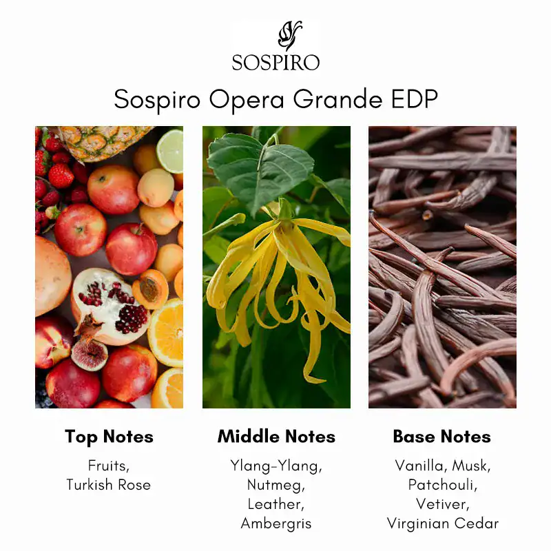 The fragrance opens with a vivid blend of juicy fruity notes and Turkish rose, creating a lush, romantic introduction that balances vibrancy with elegance. In the heart, exotic ylang-ylang and spicy nutmeg mingle with warm leather and ambergris, adding depth, complexity, and a refined spicy character. The base unfolds into a rich and sensual foundation of Virginia cedarwood, patchouli, creamy vanilla, earthy vetiver, and soft musk, anchoring the scent with warmth and lasting allure. Positioned in the oriental woody/floral family, Opera Grande balances lush sweetness and floral richness with spicy, leathery depth and warm woods—making it ideal for fall and winter evenings or any moment you want a sophisticated, memorable fragrance.