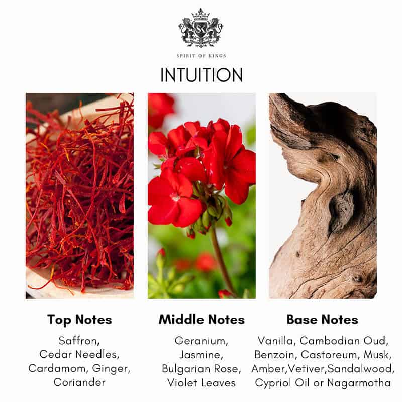 Intuition opens with a vibrant and spicy blend of saffron, cardamom, and ginger, complemented by the freshness of cedar needles and coriander. The heart reveals a rich floral bouquet of Bulgarian rose, jasmine, geranium, and violet leaves, adding depth and complexity. The base notes of vanilla, Cambodian oud, castoreum, benzoin, musk, amber, vetiver, sandalwood, and cypriol provide a warm, woody foundation, enhancing the fragrance’s longevity and leaving a captivating trail.