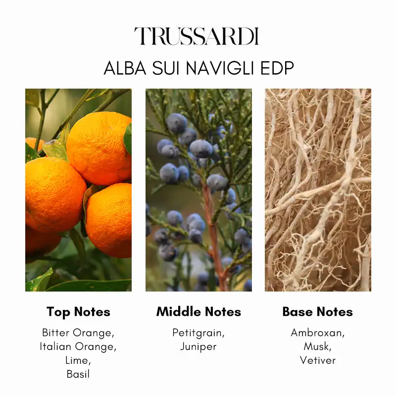 Trussardi Alba sui Navigli Eau de Parfum is a unisex fragrance introduced in 2022 as part of the “Le Vie di Milano” collection. Inspired by the vibrant atmosphere of Milan’s Navigli district at dawn, this scent encapsulates the essence of a refreshing morning by the canals, blending citrus, herbal, and woody notes.