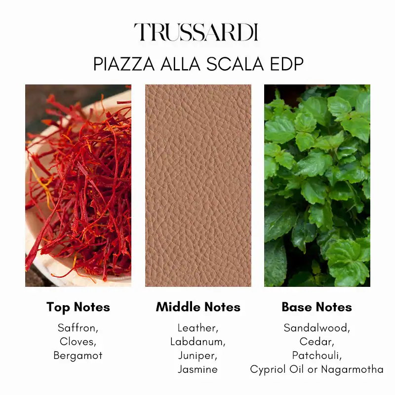 Behind the Curtain Piazza alla Scala opens with a captivating blend of saffron, clove, and bergamot, creating a spicy and slightly citrusy introduction. The heart reveals a complex composition of jasmine, labdanum, juniper, and leather, adding depth and warmth to the fragrance. The base settles into a rich, woody foundation of cedarwood, sandalwood, cypriol, and patchouli, providing a lasting and sophisticated finish. This fragrance evolves gracefully, offering a balance between boldness and refinement, much like the performances at the opera house it honors.