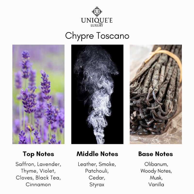 The fragrance opens with an aromatic blend of saffron, lavender, thyme, and violet enhanced by spicy cloves and cinnamon, while black tea adds a dark, slightly smoky nuance that gives the introduction a distinctive character. As the scent develops, the heart reveals a powerful leather accord supported by cedarwood, patchouli, smoky facets, and resinous styrax, creating a rich and textured middle stage. In the dry-down, olibanum (frankincense), warm woody notes, soft musk, and vanilla form a smooth yet mysterious base that balances smoky depth with subtle sweetness. Positioned within the chypre spicy leather family, Chypre Toscano delivers a layered composition that feels dark, elegant, and timeless.