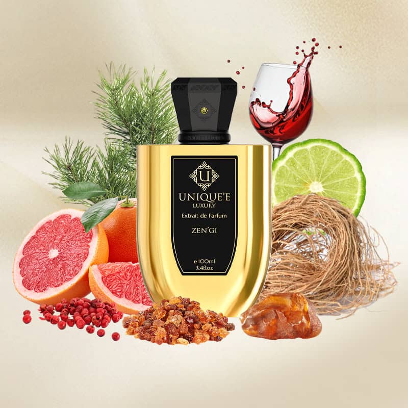 Unique’e Luxury Zen’gi Extrait de Parfum is a distinctive citrus-woody composition that merges sparkling freshness with deep amber and woody richness, creating a confident statement fragrance for those who appreciate bold niche perfumery.