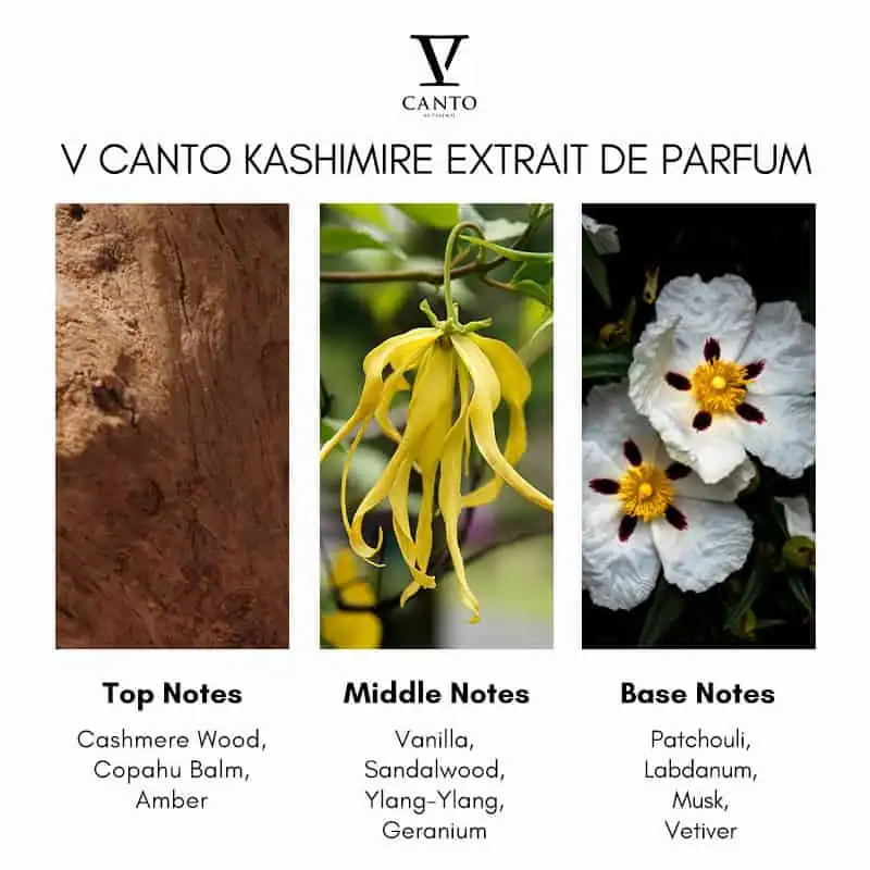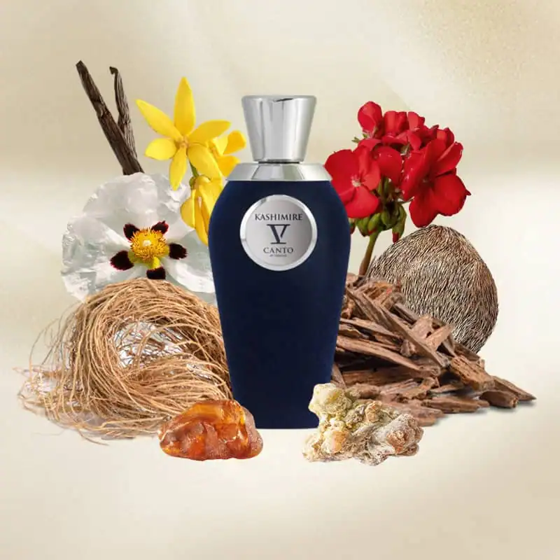 The fragrance opens with a smooth, balm-like blend of creamy cashmere wood, warm amber, and soft copahu balm, setting a plush and comforting tone. As it evolves, the heart reveals a refined balance of sweet and floral nuances—vanilla’s gentle gourmand warmth, creamy sandalwood, richly exotic ylang-ylang, and the green-spicy lift of geranium. This warmth gives way to a deep, earthy base where resinous labdanum and earthy patchouli are softened by a veil of musk and anchored by dry, grounding vetiver. V Canto Kashimire Extrait de Parfum is a woody amber composition that envelops the skin in a sensual embrace—ideal for cooler seasons and intimate settings.
