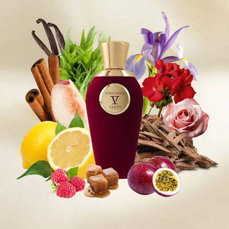 V Canto Stricnina is a bright, sweet fruity fragrance with notes of passion fruit, raspberry, and vanilla. Very long-lasting and powerful, it leaves a delicious, gourmand trail. Perfect for those who love rich and sensual scents.